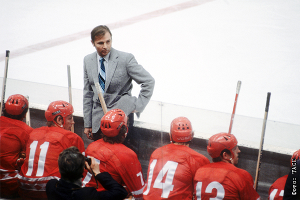 Тренер сборной СССР по хоккею Виктор Тихонов во время игры в 1979 году.