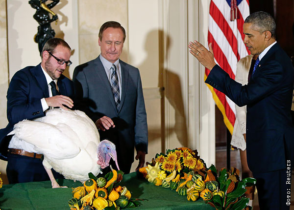 Президент США Барак Обама во время церемонии "помилования" главного индюка страны по кличке "Сыр" в Белом доме. Согласно традиции, каждый год американский лидер оставляет в живых индейку, которая должна была быть подана к его столу в честь Дня благодарения.