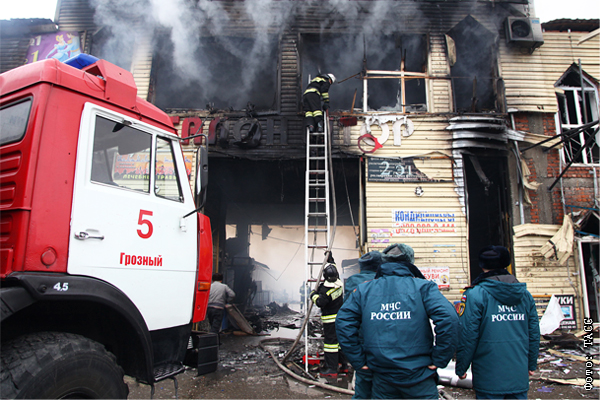 Сотрудники МЧС и пожарные борются с огнем, охватившем торговые помещения