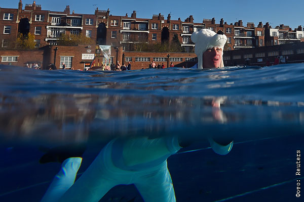 Участник ежегодного заплыва December Dip в маскарадном костюме. Мероприятие проходит в Лондоне ежегодно. В 2014 на соревнование в пятиградусной воде отважились 400 человек.