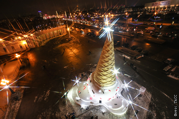 Вид на паблик-арт елку в виде скульптурного объекта "Рожок" у входа в Парк Горького