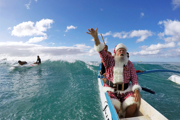 Дональд Бойс, переодетый в Санта-Клауса, рассекает волны в каное у пляжа Ваикики в Гонолулу, Гавайи