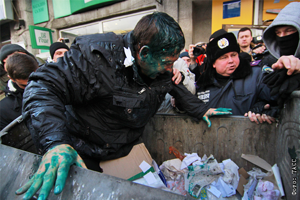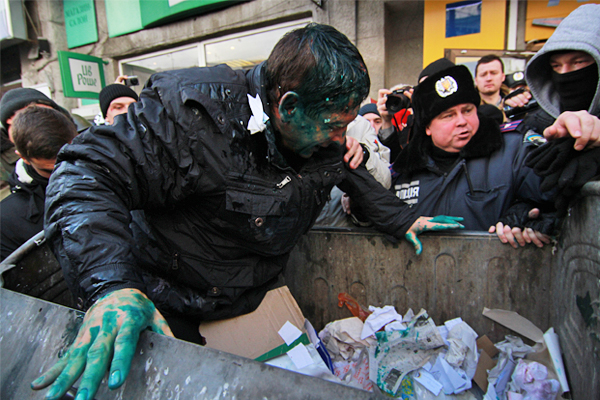 В Харькове сотни активистов пытались прорваться в здание горсовета, требуя отставки мэра города. Митингующие засунули в мусорный бак депутата от Партии регионов Владимира Скоробогача, облили его зеленкой и забросали яйцами.