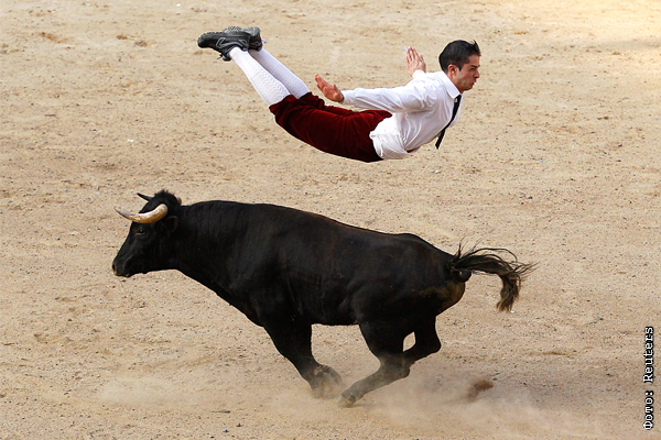 Испанский рекортадор перепрыгивает через быка во время шоу в Кали, Колумбия