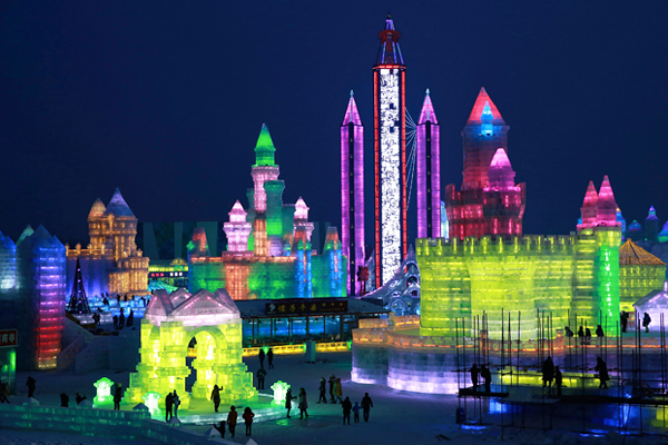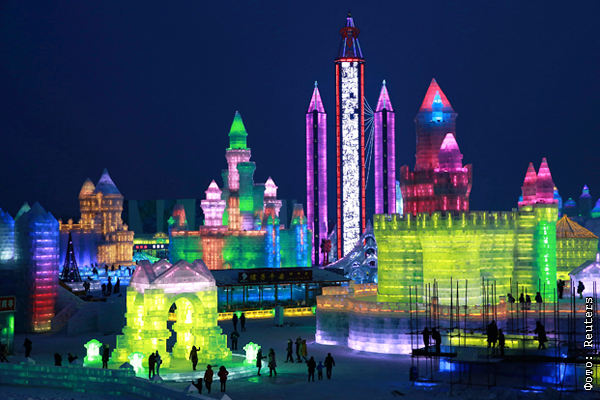 Люди любуются разноцветными ледяными скульптурами в Харбине на международном фестивале льда и снега, провинция Хэйлунцзян, Китай
