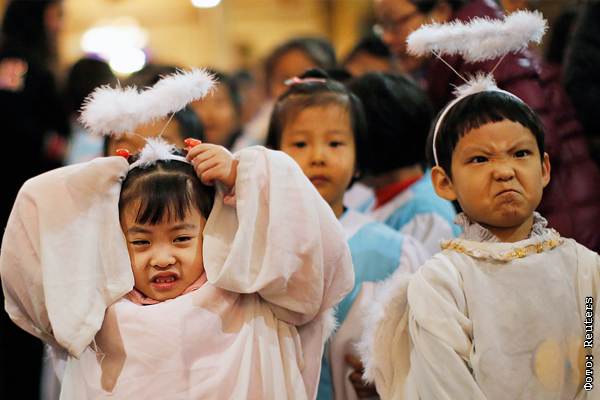 Дети в костюмах ангелов во время рождественской мессы в католической церкви Пекина