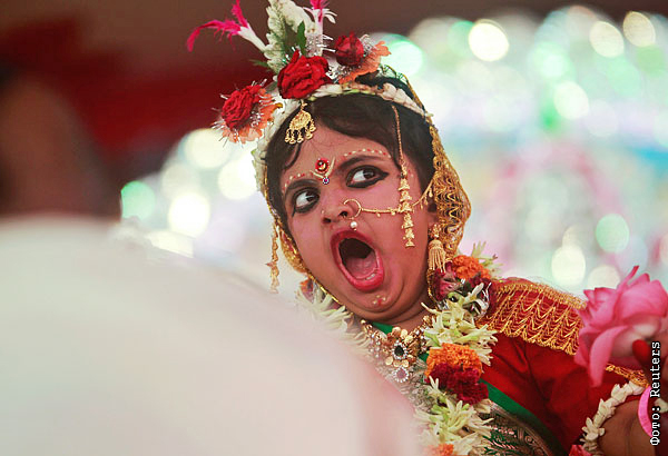 Во время молитвы на религиозном фестивале Дурга Пуджа в Индии. Героине немного жмет кольцо в носу. Наверное.