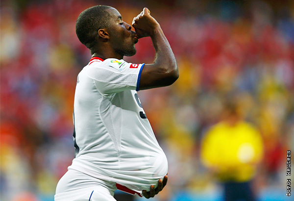Игрок сборной Коста-Рики Джоэл Кэмпбелл празднует гол в ворота Уругвая в групповом матче чемпионата мира в Бразилии. Страшно представить, что могло бы произойти, выбери он дротики вместо футбола.