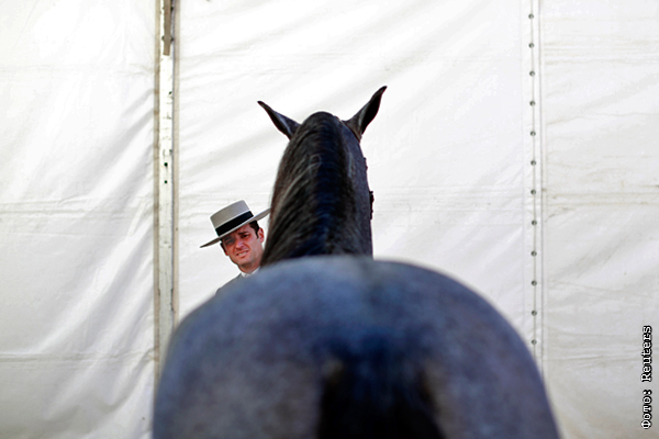 Всадник смотрит на своего коня перед международной выставкой андалузских лошадей в Севилье, Испания. Некоторые художники из похожих сцен делают перформансы.