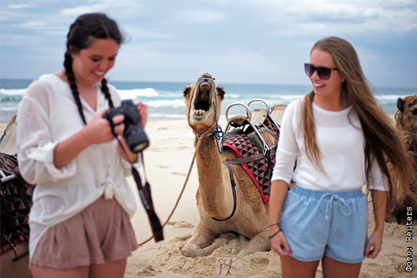 Туристы перед началом прогулки на верблюдах, Австралия. Нетрудно догадаться, что там кричит этот верблюд: наверное, что-то про марку фотоаппарата девушки слева.