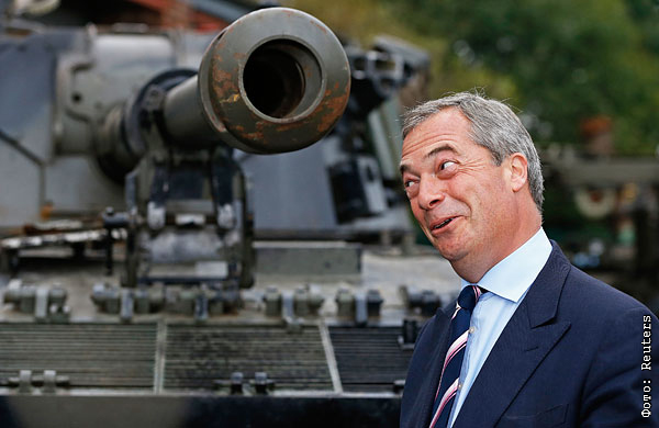 Лидер Партии независимости Великобритании Найджел Фараж во время посещения танкового музея в Манчестере. Остается только догадываться, какие мысли его посетили в этот момент.