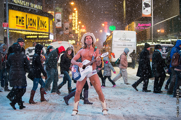 Роберт Берк, также известный по кличке "Голый ковбой", выступает в снежную бурю на Таймс-Сквер в Нью-Йорке. Глядя на эту картинку, радуешься тому, что некоторым из наших звезд уже не надо искать популярности схожим образом. Да и вообще - не надо.