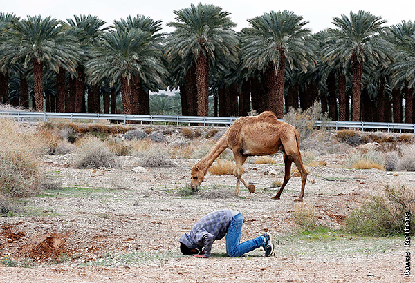 Бедуин молится возле своего верблюда в Иудейской пустыне в Израиле