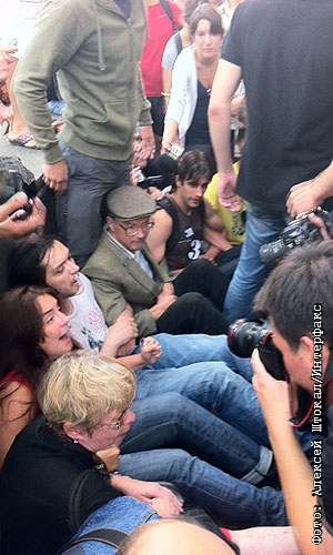 В воскресенье оппозиция провела акцию в защиту 31-й статьи Конституции РФ в необычной форме - митинг на этот раз был "сидячим"% около 40 участников акции расположились на асфальте с плакатами рядом с Концертным залом имени Чайковского и на углу площади около ресторана "Пилзнер"