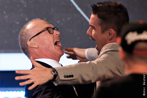Актер Итан Хоук (справа) поздравляет Майкла Китона с победой в номинации "Лучший актер"