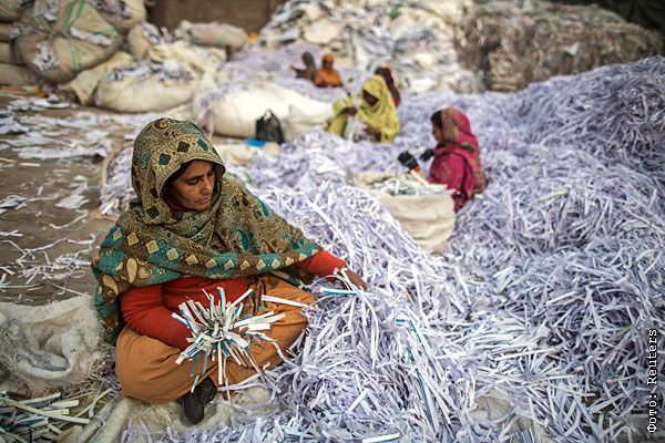 Сортировка бумаги перед заводской переработкой. Пакистан.