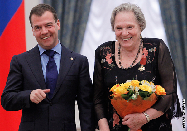 Дмитрий Медведев и актриса Римма Маркова, награжденная орденом "За заслуги перед Отечеством" IV степени, на церемонии вручения государственных наград в Екатерининском зале Кремля, 2010 год
