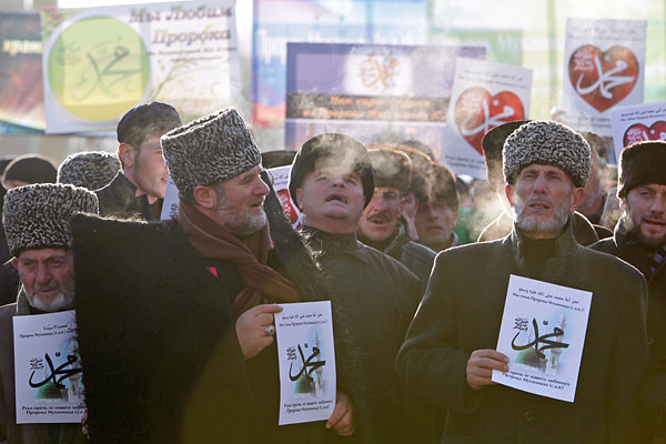 В столице Чечни проходит шествие верующих, которые выступают против публикации карикатур на пророка Мухаммеда