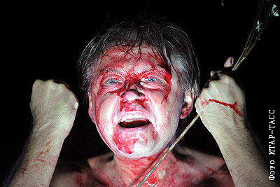 Актер Дариус Мешкаускас (Гамлет) в сцене из спектакля литовского режиссера Оскараса Коршуноваса "Гамлет" по одноименному романы У. Шекспира на XIX Международном театральном фестивале "Балтийский дом"