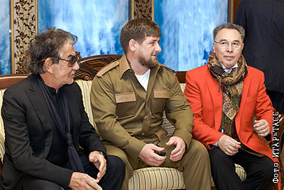 Модельеры Роберто Кавалли и Вячеслав Зайцев и президент Чечни Рамзан Кадыров перед началом показа молодежной коллекции одежды чеченских дизайнеров Лауры и Медни Аржиевых на открытии студии дизайна и моды