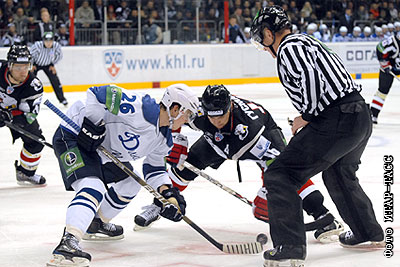 Игроки "Динамо" Иржи Гудлер и "Трактора" Равиль Гусманов (слева направо на первом плане) в матче чемпионата КХЛ: "Трактор" (Челябинск) – "Динамо" (Москва) - 2:4