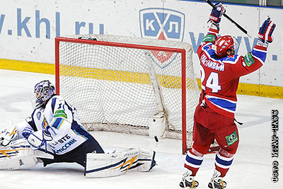 Гол в ворота вратаря МВД Алексея Волкова (слева), забитый игроком ЦСКА Петром Счастливым (справа), в матче чемпионата КХЛ: ЦСКА (Москва) – ХК МВД (Московская область) - 3:2