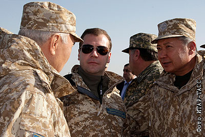 Президент Киргизии Курманбек Бакиев и президент России Дмитрий Медведев во время встречи на полигоне "Матыбулак", где проходит заключительная фаза комплексных специальных учений стран-участниц Организации Договора о коллективной безопасности "Взаимодействие-2009"