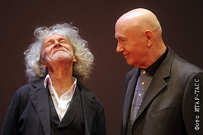 Актеры Александр Леньков и Леонид Куравлев (слева направо) на премьере фильма режиссера В.Соколовского "Книга мастеров" в кинотеатре "Октябрь"