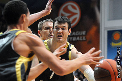 Игрок "Реала" Кшиштоф Лавринович (справа) в матче Евролиги УЛЕБ по баскетболу: "Химки" (Москва) - "Реал" (Мадрид)