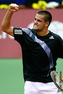 оссийский теннисист Михаил Южный, победивший серба Янко Типсаревича со счетом 6:7, 6:0, 6:3 в финальном матче XX Международного теннисного турнира Кубок Кремля в СК "Олимпийский"