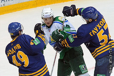 Игроки "Салавата Юлаева" Алексей Медведев (в центре) и "Атланта" Денис Бодров, Алексей Глухов (слева направо в синей форме) в матче чемпионата КХЛ: "Атлант" (Московская область) – "Салават Юлаев" (Уфа) - 0:6