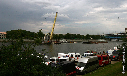 Спасатели транспортируют поднятый со дна Москва-реки катер к берегу. Катер сильно разрушен, многие конструкции и стойки на палубе корабля деформированы или уничтожены полностью.