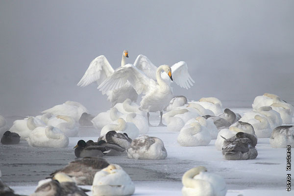 Лебеди и утки на замерзшем озере в селе Урожайное Алтайского края