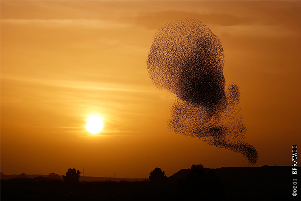 Cтая скворцов образует "танцующее облако" в небе над городом Рахат на юге Израиля