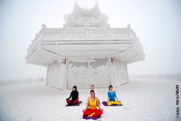Занятия йогой на свежем воздухе в городе Чжанцзяцзе в Китае