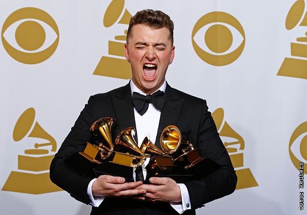 Британский исполнитель Сэм Смит, одержавший победу в трех номинациях, со своими наградами