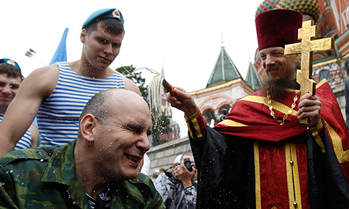 Десантники во время торжественного молебна на Красной площади в День Ильи Пророка - покровителя российских ВДВ.