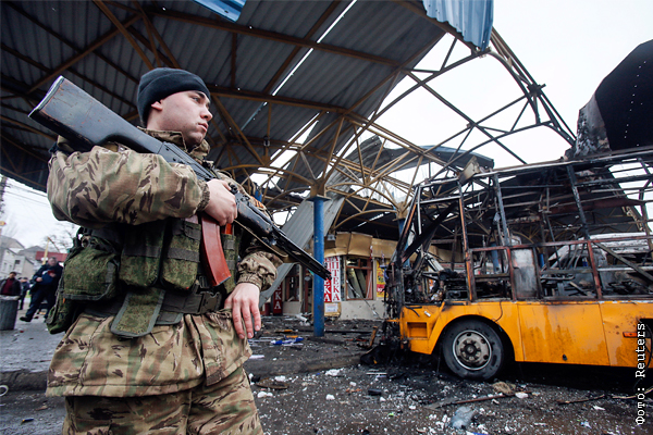 Разрушенные павильоны на автостанции в Донецке, где в результате попадания снаряда сгорел маршрутный автобус, 11 февраля