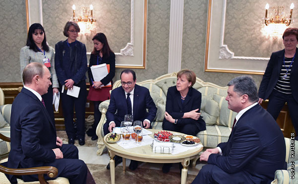 Лидеры стран "Нормандской четверки" (Украины, Германии, Франции и России) собрались в Минске вечером 11 февраля на неформальный саммит, чтобы выработать план урегулирования конфликта на востоке Украины. Встреча продолжалась более 17 часов, по ее итогам был согласован и подписан Комплекс мер по выполнению Минских соглашений, предусматривающий перемирие, отвод тяжелых вооружений, создание буферной зоны и обмен пленными.