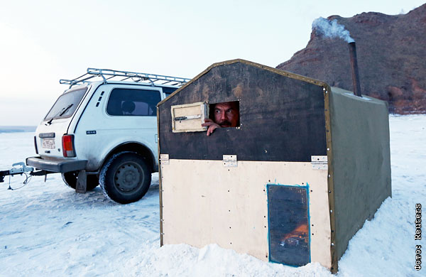 Рыбацкий фанерный домик на берегу реки Енисей