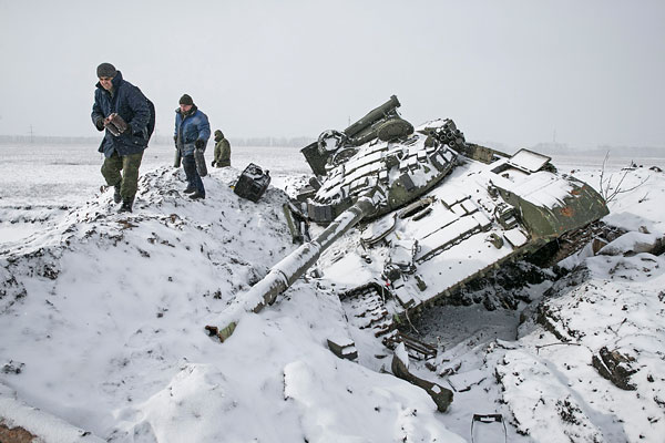 Ополченцы ДНР у разрушенного танка украинской армии в Углегорске