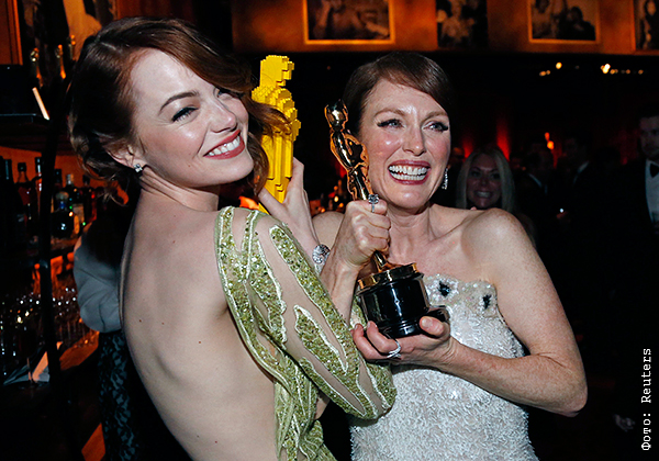 Эмма Стоун с "Оскаром" из лего и Джулианна Мур с "Оскаром" за лучшую женскую роль