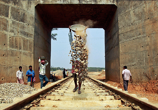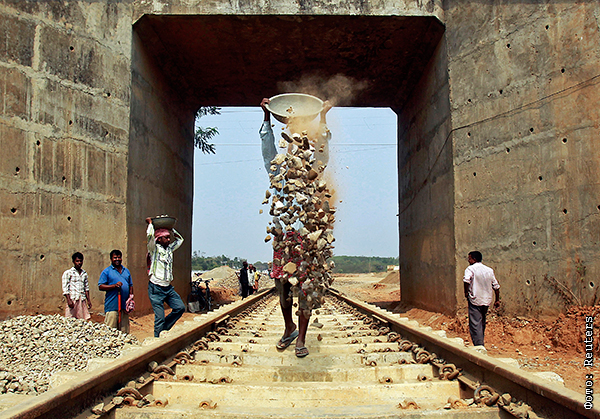 Рабочие на месте строительства нового железнодорожного пути на окраине северо-восточного индийского города Агартала
