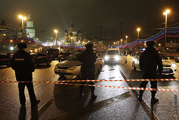 2015 год. Оцепление на месте убийства Бориса Немцова на Большом Москворецком мосту.