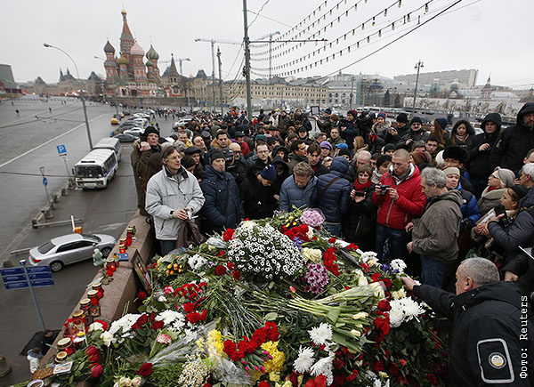 Москвичи несут цветы к месту убийства Бориса Немцова