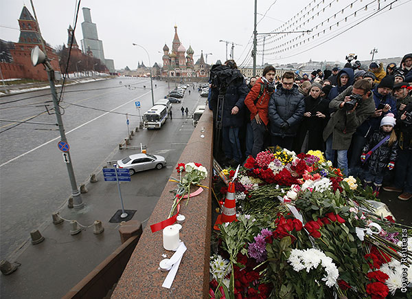 Люди весь день приносят цветы на Большой Москворецкий мост, где накануне был застрелен Борис Немцов