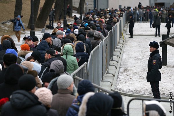 Жители Москвы у Сахаровского центра перед церемонией прощания с Борисом Немцовым