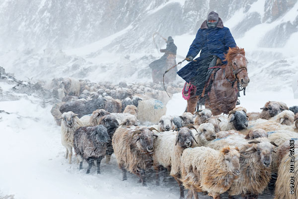 Пастухи перегоняют овец на весеннее пастбище. Синьцзян-Уйгурский автономный район, Китай.