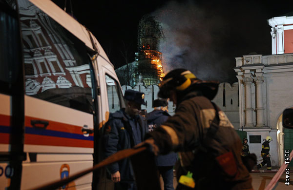 Поздно вечером в воскресенье загорелись строительные леса вокруг колокольни Новодевичьего монастыря. На место прибыли пожарные расчеты - 113 человек личного состава ГУ МЧС и 29 единиц техники. Колокольня была охвачена огнем на высоте от 30 до 70 метров. Локализовать возгорание удалось к 0:22 понедельника. Его площадь составила 300 квадратных метров.