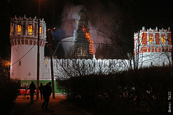 Поздно вечером в воскресенье загорелись строительные леса вокруг колокольни Новодевичьего монастыря. На место прибыли пожарные расчеты - 113 человек личного состава ГУ МЧС и 29 единиц техники. Колокольня была охвачена огнем на высоте от 30 до 70 метров. Локализовать возгорание удалось к 0:22 понедельника. Его площадь составила 300 квадратных метров.